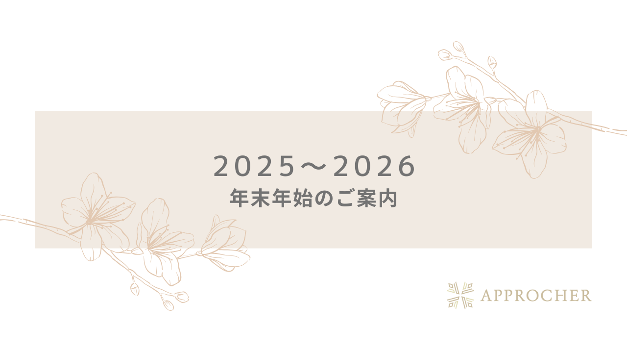 12 December 2025お知らせ 2025~2026 年末年始のご案内 アプロッシェは2025年12月27日(土)~2026年1月4日(日)まで休業日といたします。 新年は2025年1月5日(月)より営業開始です。 BACK